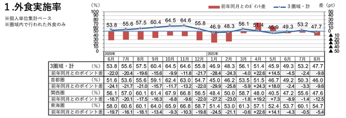 ホットペッパーグルメ外食総研による外食市場調査※の2021年8月度調査結果では、2021年8月の外食市場規模は、3圏域合計で1,395億円。前年同月比は66.4%、2019年8月比では40.1%だった。