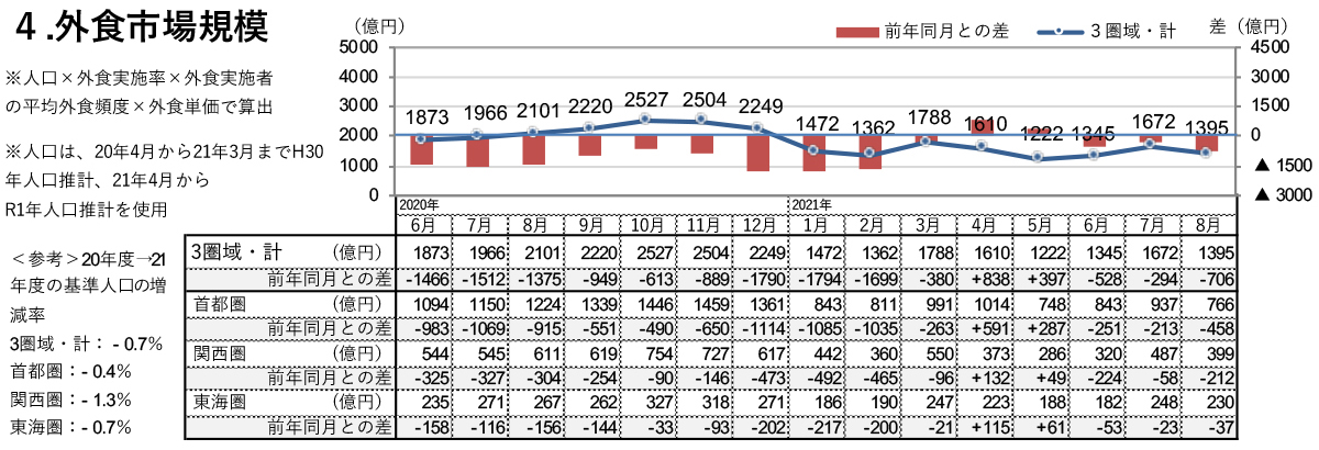 2021年8月の外食市場規模は、3圏域合計で1,395億円。前年同月比(以下、前年比)は−706億円。市場規模は3カ月連続で前年比マイナスを記録した。コロナ禍以前の2019年8月比では40.1%と7月(2019年比48.1%)からマイナス幅が8.0pt拡大した。