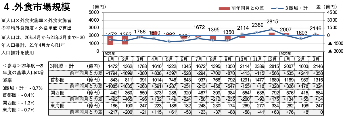 コロナ禍関連状況では、3月後半には全国全地域でまん延防止等重点措置の解除があり、外食市場の回復傾向を後押ししたと考えられる。