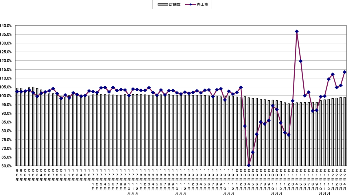 売上高と店舗数の伸び率推移(〜2022年4月)