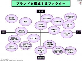 縦軸に商品・販売活を置き、横軸にハードとソフトを置いて区分し整理している。このチャートを作る作業を通じて、各社の首脳によって語られたブランドに関するキーワードには、極めて共通するところが多いことがわかった。