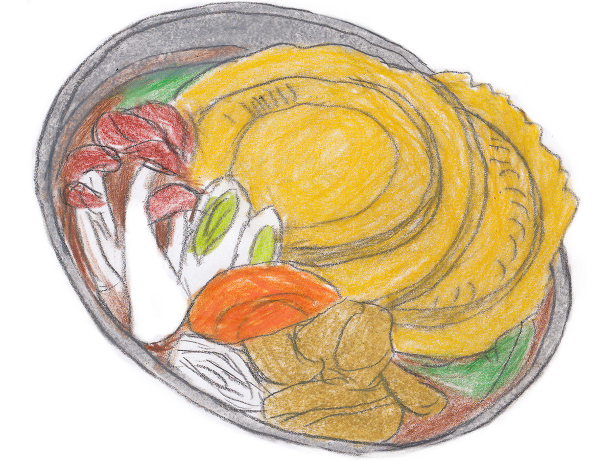 2泊3日の修学旅行1日目。最初に立ち寄った青森県・十和田湖畔のドライブインで出された昼食は「せんべい汁」。青森県南東部から岩手県北部にかけての郷土料理ということで、ネギ、ニンジン、しめじ、ゴボウ、鶏肉、糸こんにゃくなどの具材と南部せんべいが入った汁である。